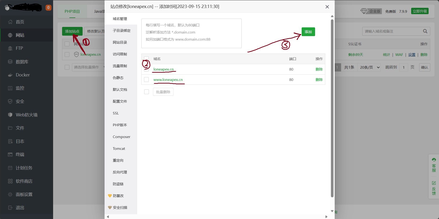然后把新网站添加到宝塔(我这里手贱把之前的网站删掉了,应该有旧网站和新网站俩才对)