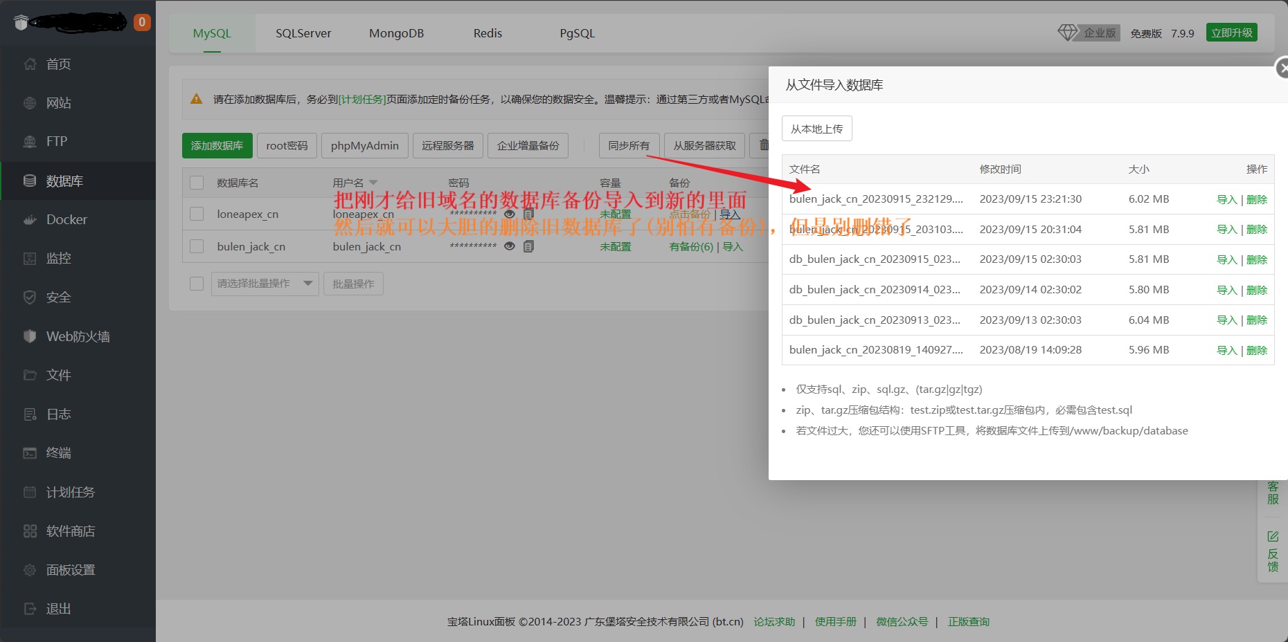 在宝塔打开数据库,把刚刚备份的旧网站数据库 导入到 新网站的数据库