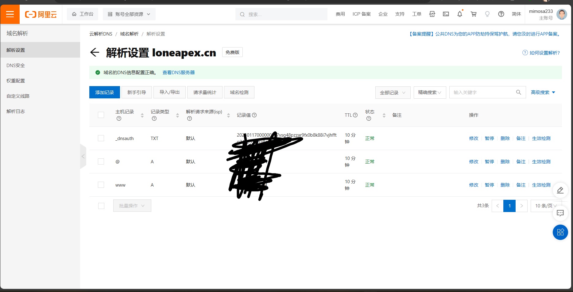 之后在阿里云把旧域名的解析加到服务器上(解析添加服务器IP地址)