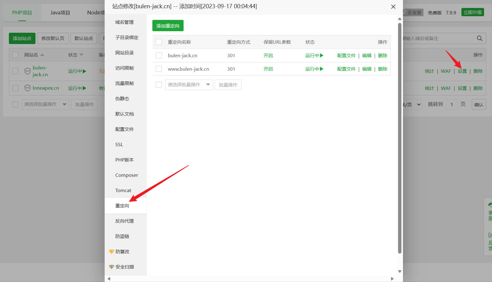 所以,把旧域名再添加到宝塔,我们只用重定向,所以数据库啥的都不需要
