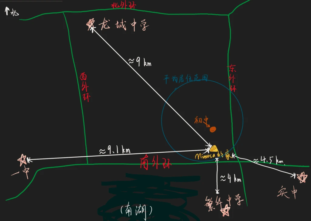 但,事实真的如此嘛?在我们这里公认的四所中学(具体见下图,Mimsoa手绘的哦),新建成的繁华中学环境和餐食最好,一中、实中升学率搞,但龙中距离最远、建校最早、环境又最差,甚至听说寝室风扇都是坏的……