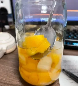 那么回到正题。感冒后,也是顺理成章的买了一个黄桃罐头吃。