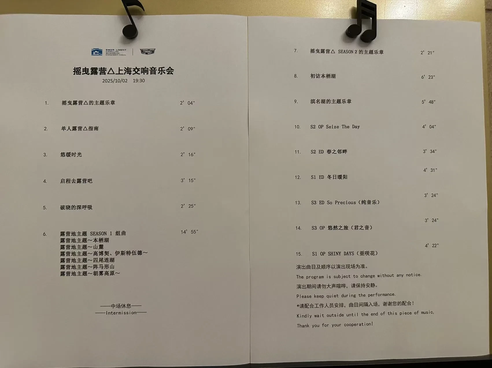 《摇曳露营》系列作品是我在两年前看的了,本以为记忆已经模糊,再去听音乐会并没有什么实感,但恰恰相反,这次演出真的治愈到我了。尤其是初访本栖潮、滨名湖等组曲,不知不觉间就想到凛子在夜色中的帐篷旁吃着杯面、眺望富士山脚下的新年日出……当熟悉的旋律响起时,不知不觉间便沉浸在那些悠闲的露营时光中,忘却了时光了流逝……或许正如主办方所说的,「这不是一场音乐会,而是一次献给所有向往自由与温暖灵魂的集体露营。」