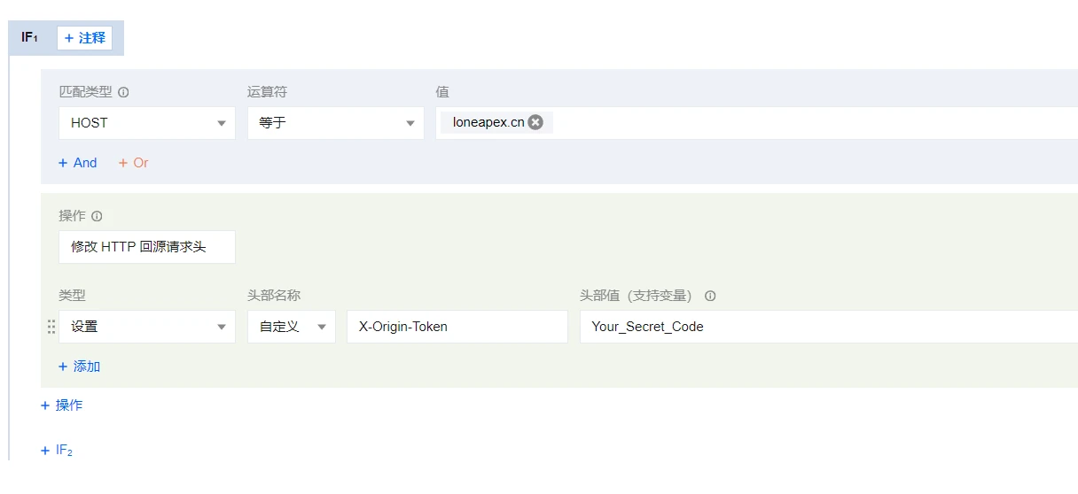 我们需要在 CDN 节点的回源请求中加入这个字段(字段名和内容可自定义,建议尽量复杂):
