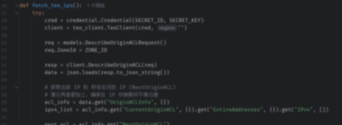 参考边缘安全加速平台 EO 源站防护(获取/更新 EdgeOne 回源 IP 网段)文档,我们可以写一个 Python 程序来自动更新 IP 段(实则是由ChatGPT和Gemini帮我写的):