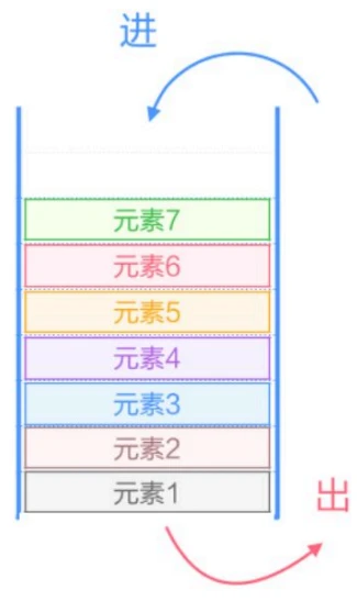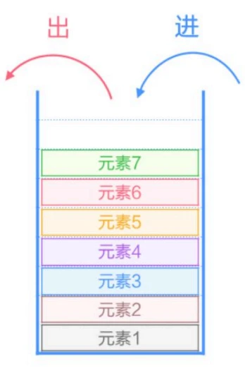 允许进行插入和删除元素的一端称为栈顶(元素7),不允许插入和删除元素的一端称为栈底(元素1)。
